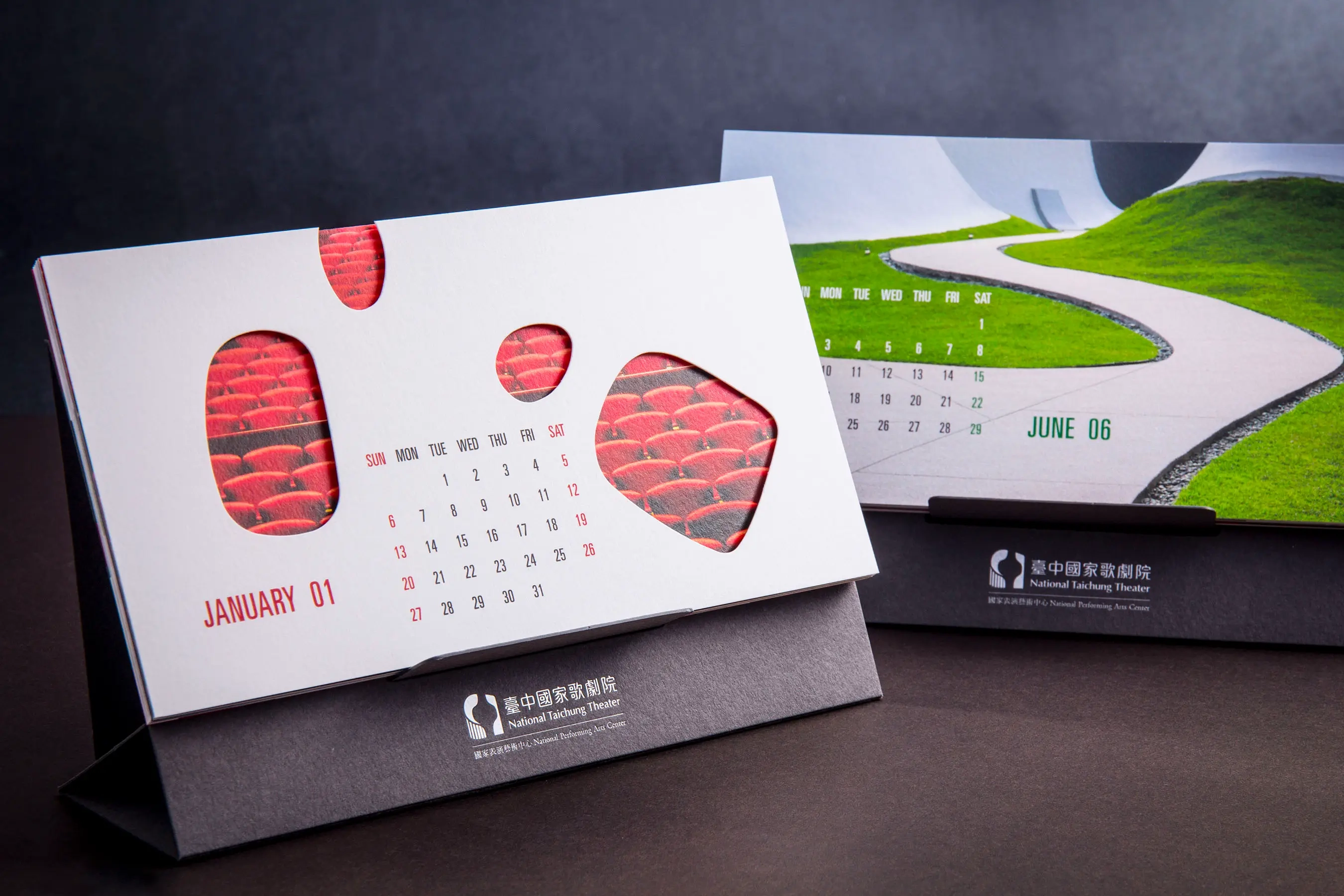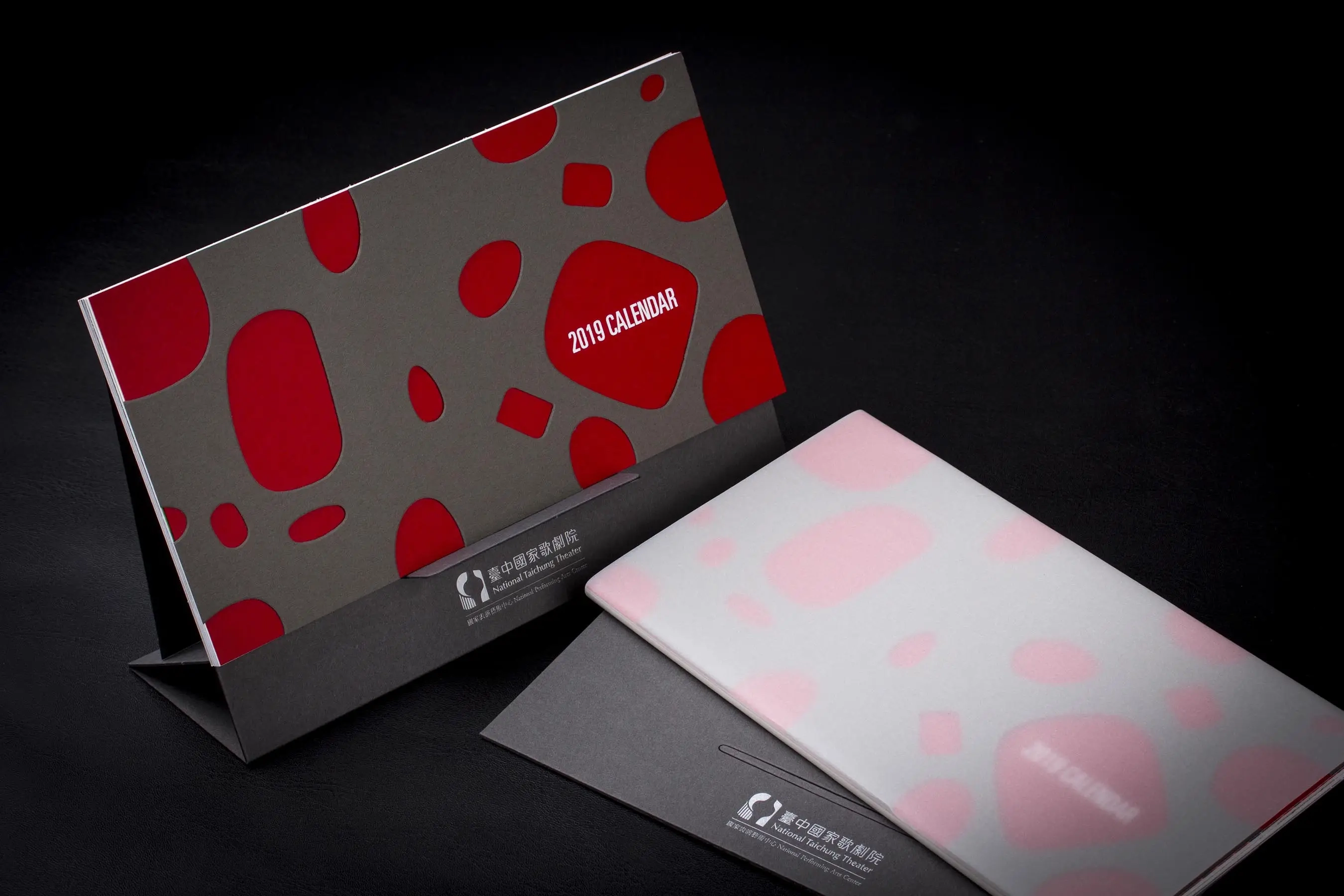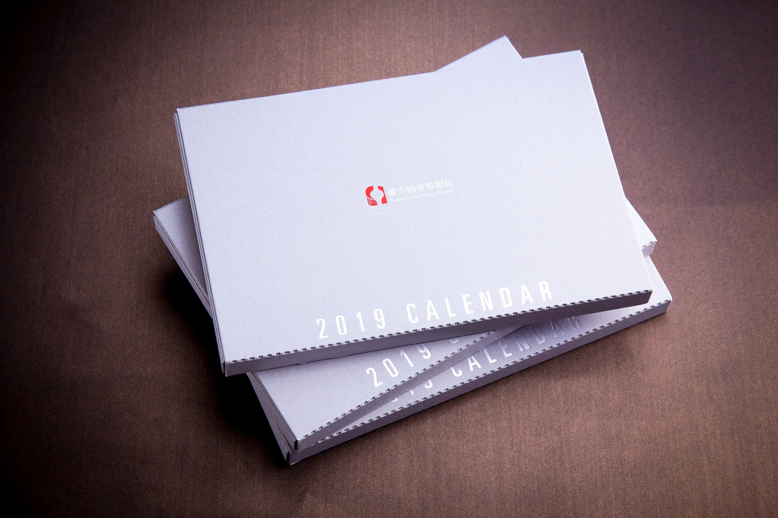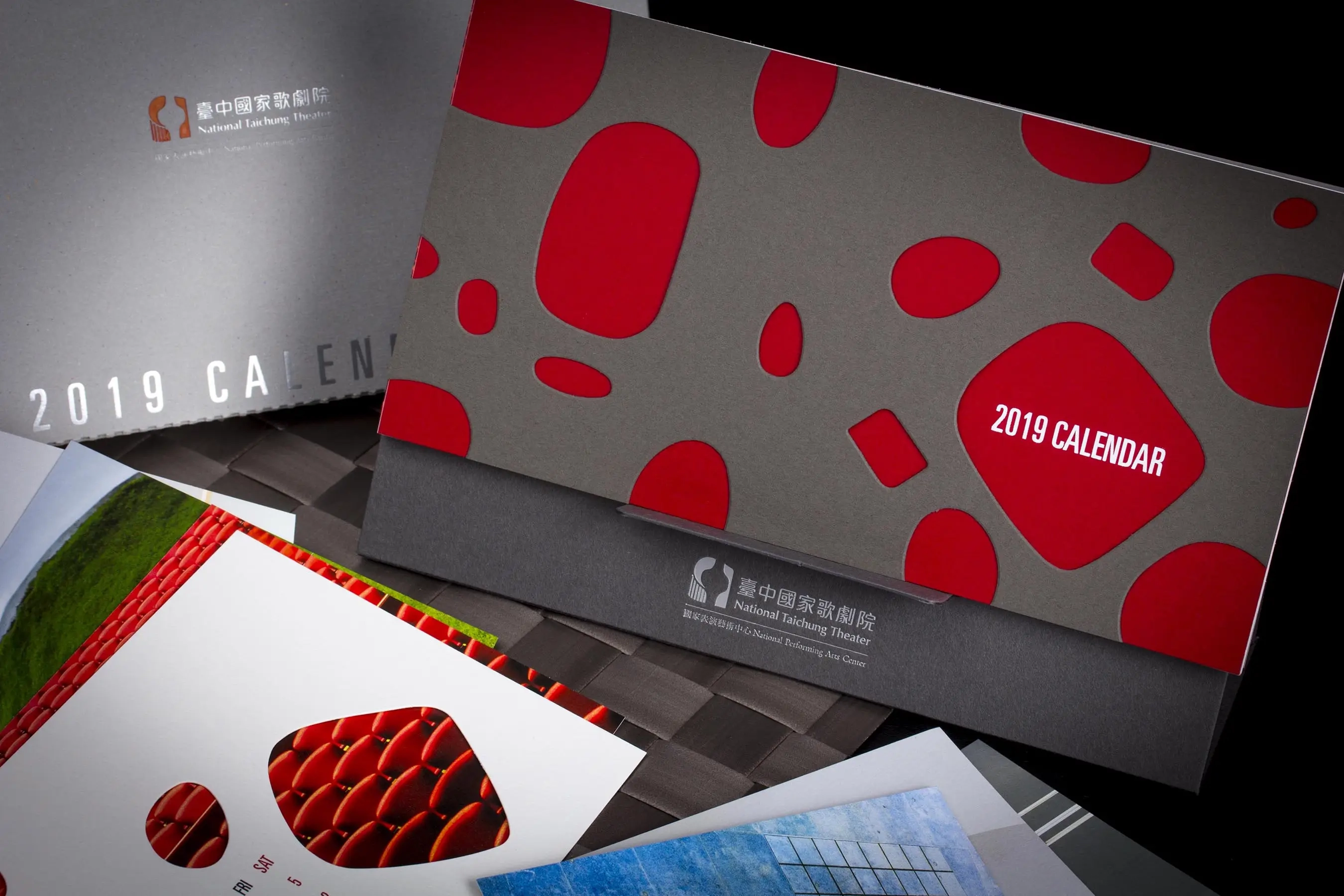 臺中國家歌劇院造型前衛,以「美聲涵洞」概念,採用曲牆、孔洞與管狀等別具一格的設計,整棟建築完全沒有樑柱支撐,也無一處為90度牆面,顛覆了一般建築物的概念。2019年桌曆的封面及單月份設計上,也延續曲牆、孔洞與管狀的建築風格。