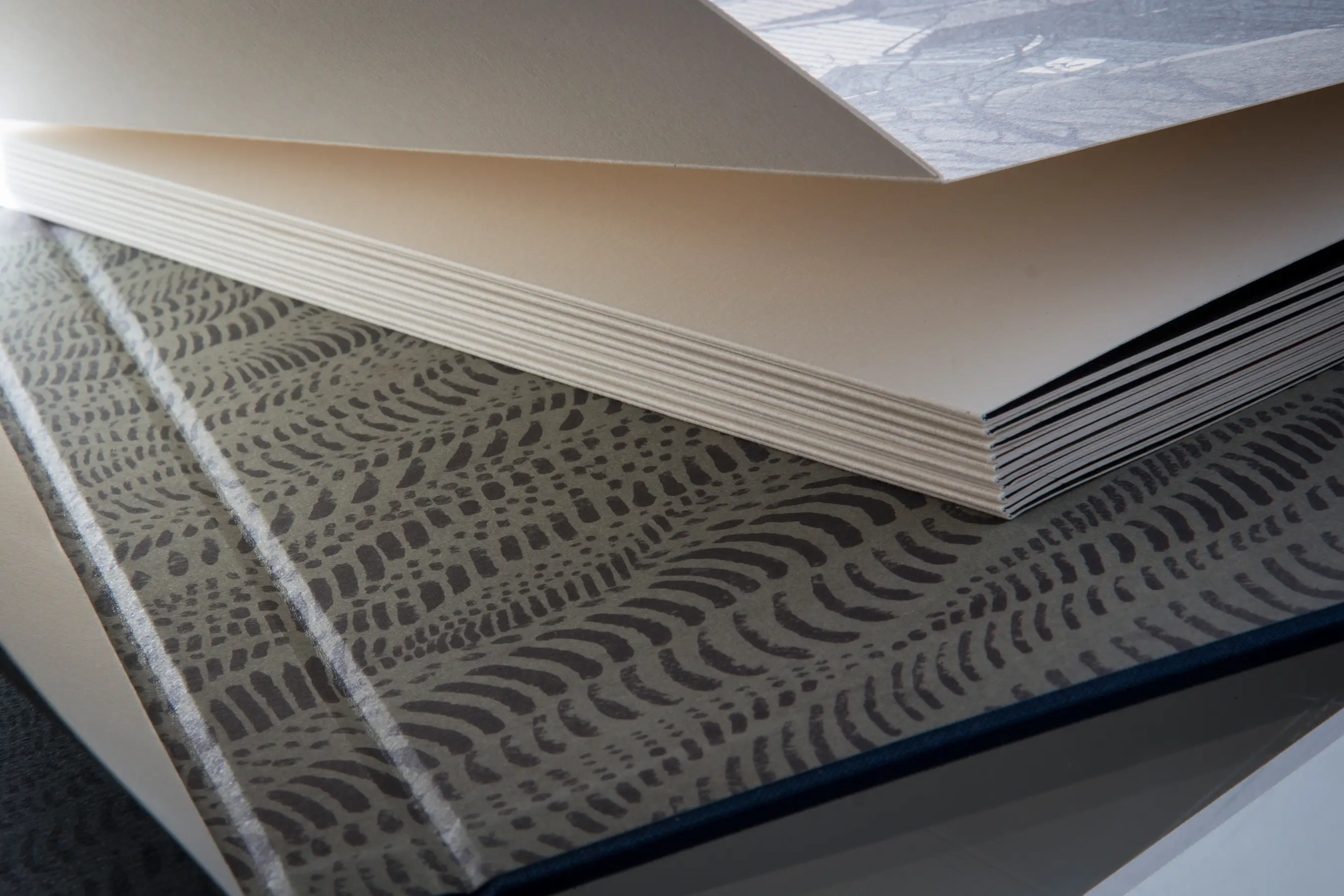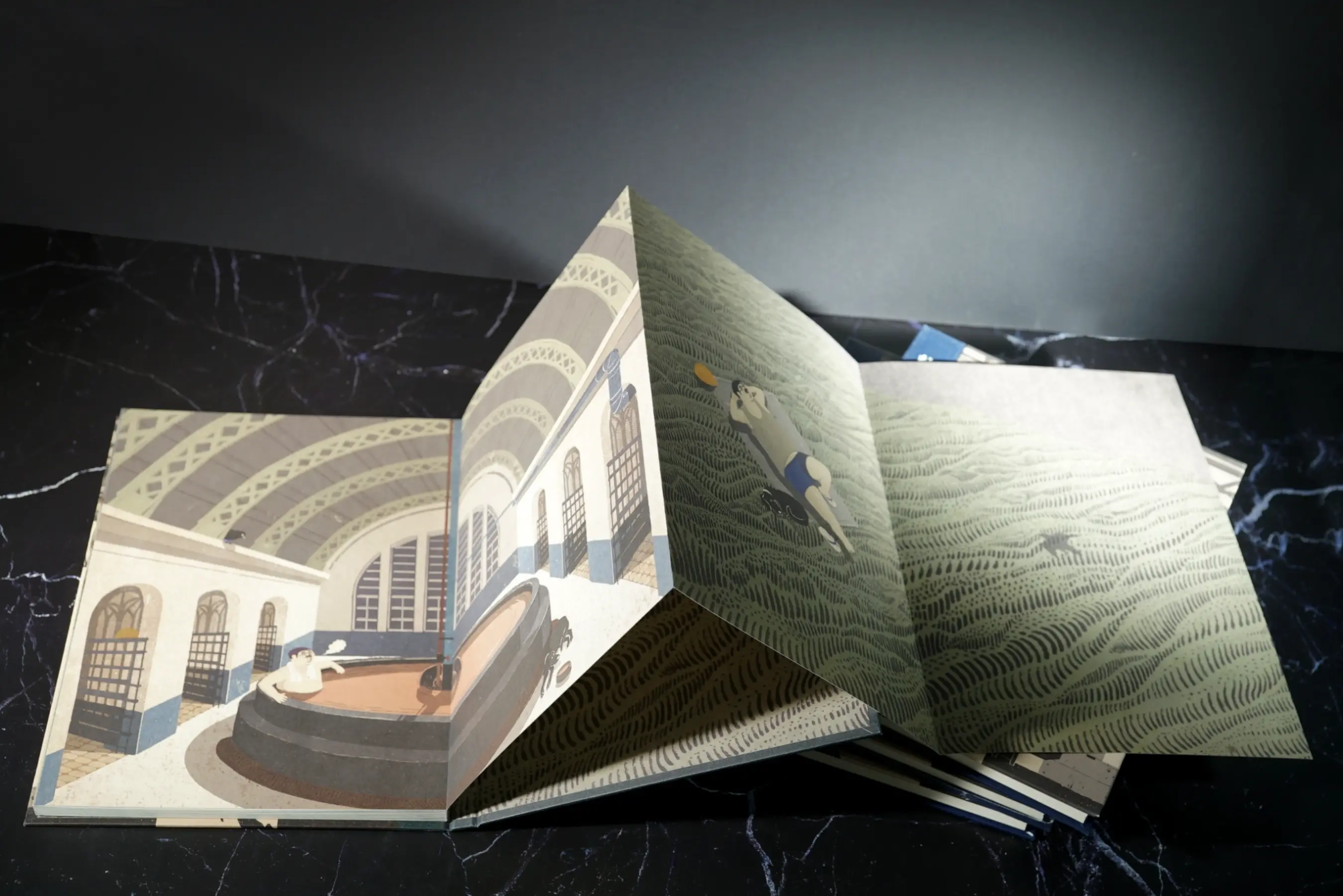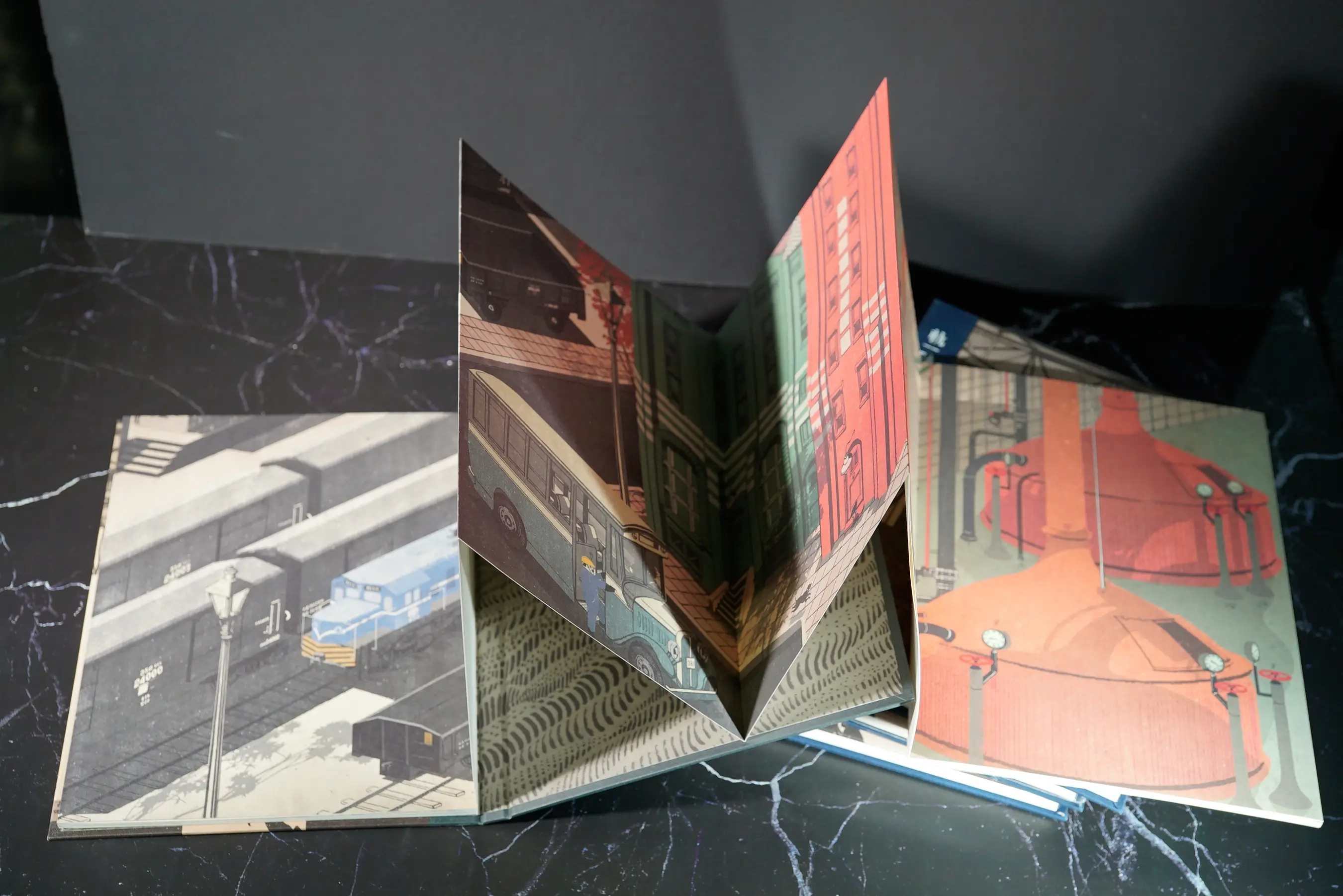 內文以厚磅非塗佈進口紙印刷,呈現古樸景象。裝訂用連續經折裝方式成冊,呈現連續的故事,並展現火車長型的意象。