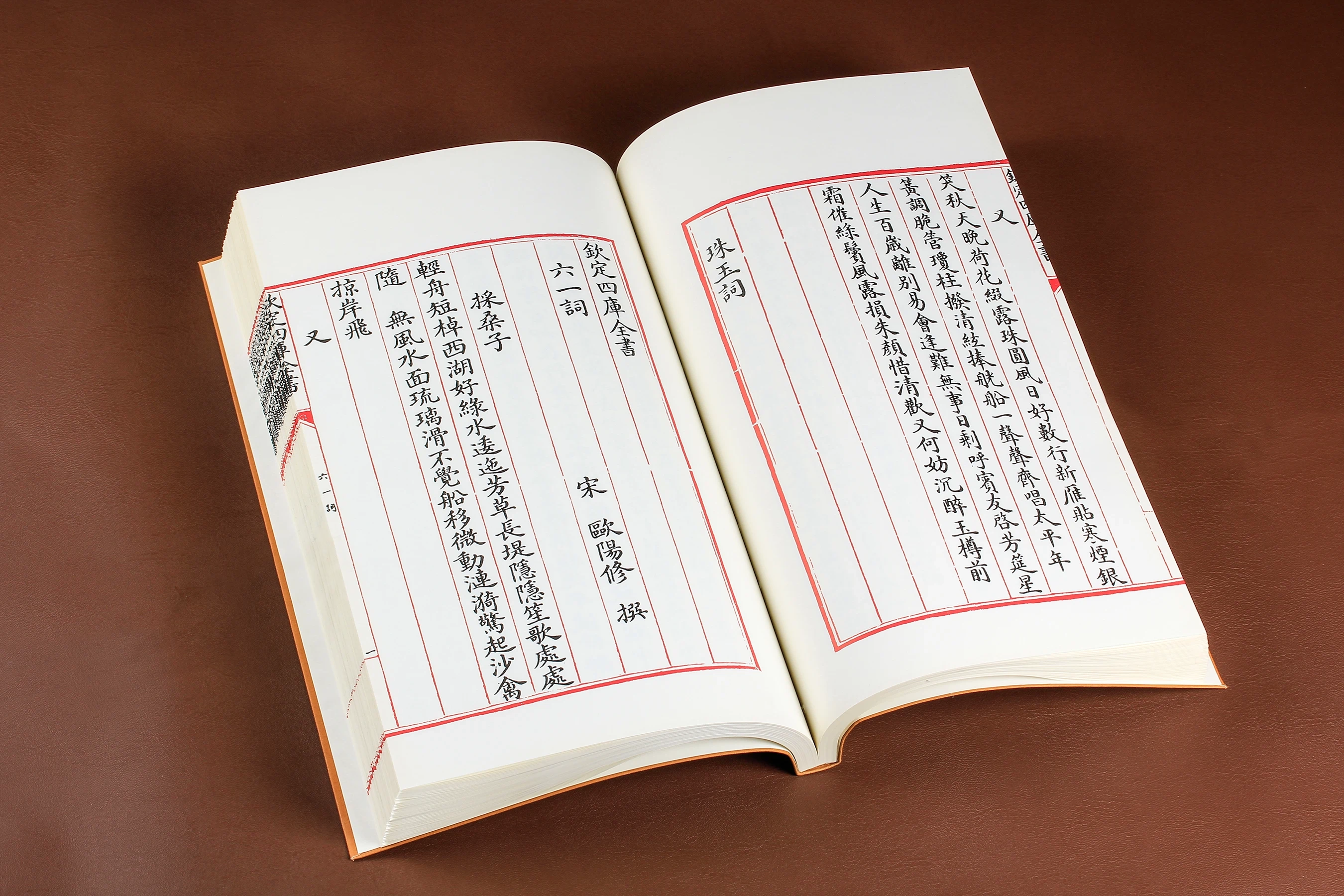 書本尺寸:318x210mm、內頁版框:224x154mm。 七套手抄本四庫全書歷經多次戰火,現今世上僅存三套半:文淵閣本、文溯閣本、文津閣本、文瀾閣本(半套)。