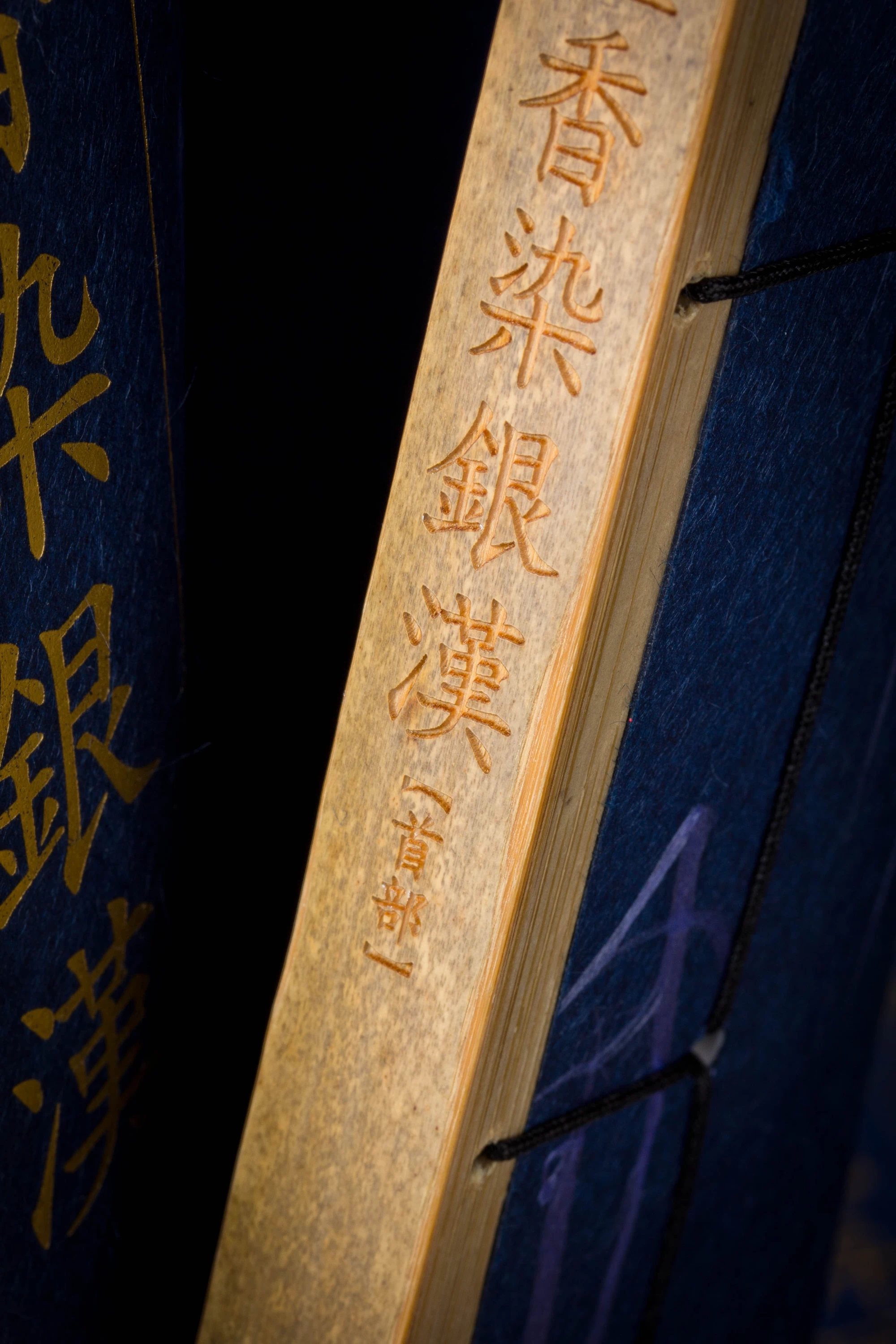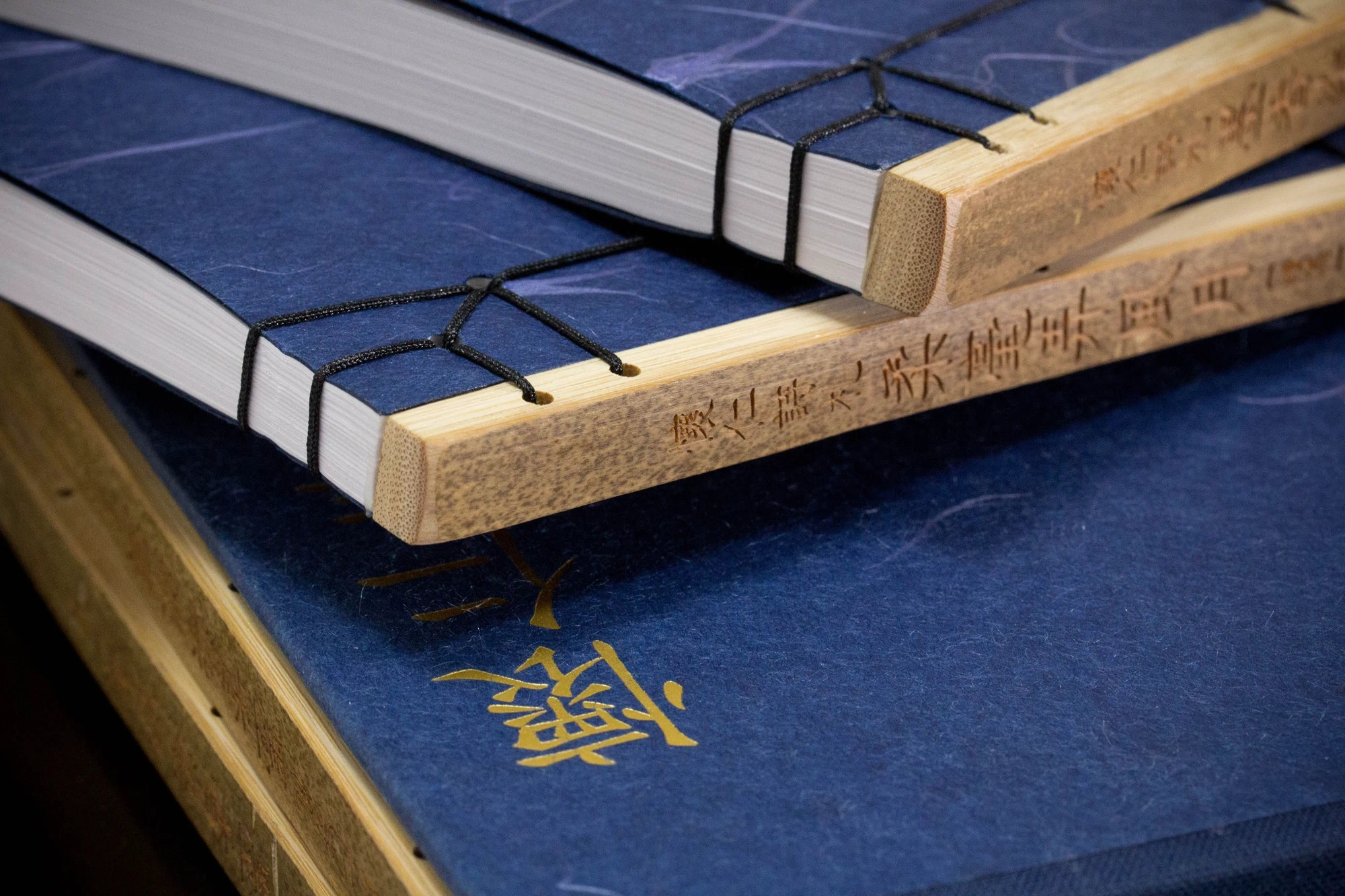 竹子纖維特多,圓竹經巧手俏切、鑽孔後,必須再以砂紙手工打磨去除纖維,並精準同書背的寬度,雖然工序繁雜耗時,但成書後效果特好。