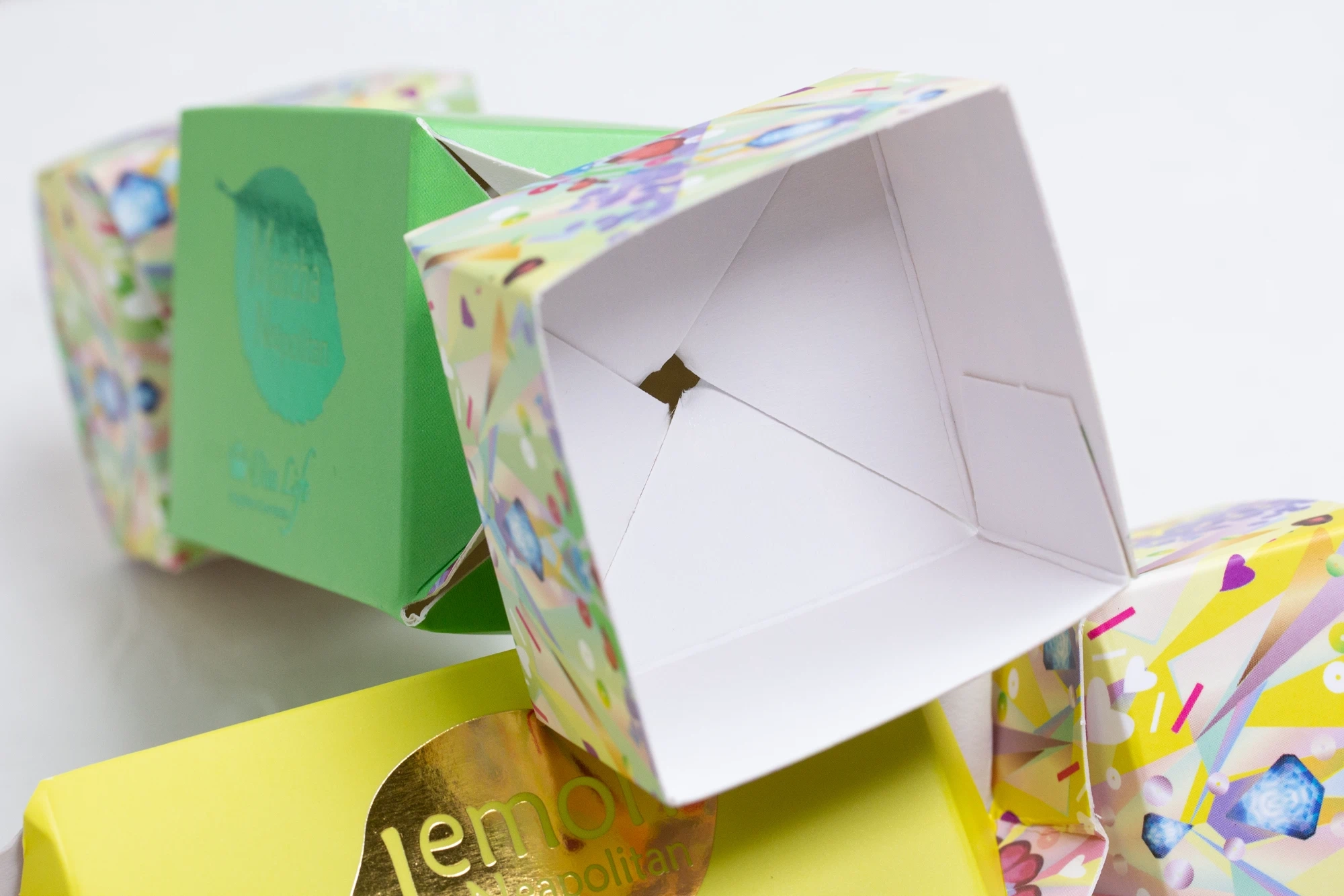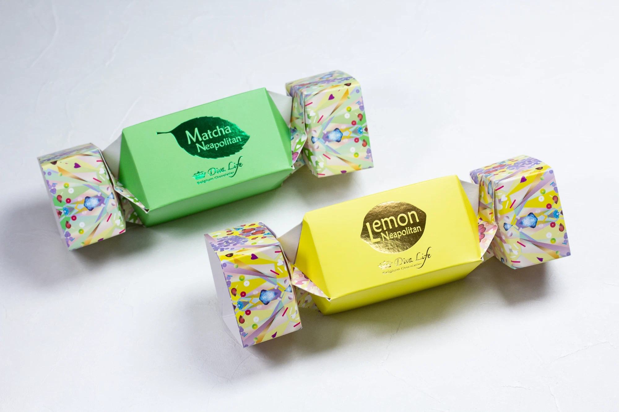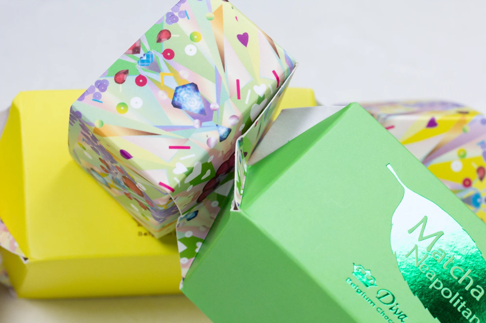 設計師巧妙的運用糖果印象,製作了盛裝進口巧克力的包裝結構。採用了300磅新白金卡裱霧P,選用討喜的粉黃以及粉綠當作底色。搭配耀眼的燙金,讓整個產品包裝非常的討喜。