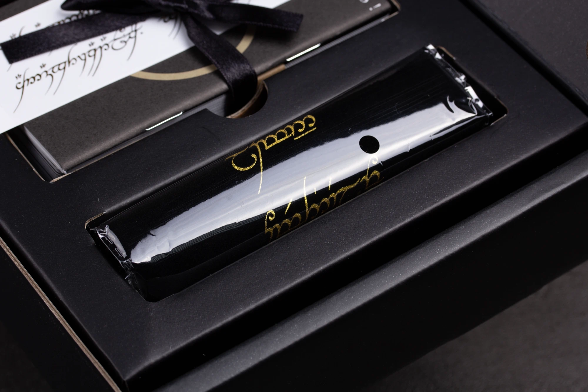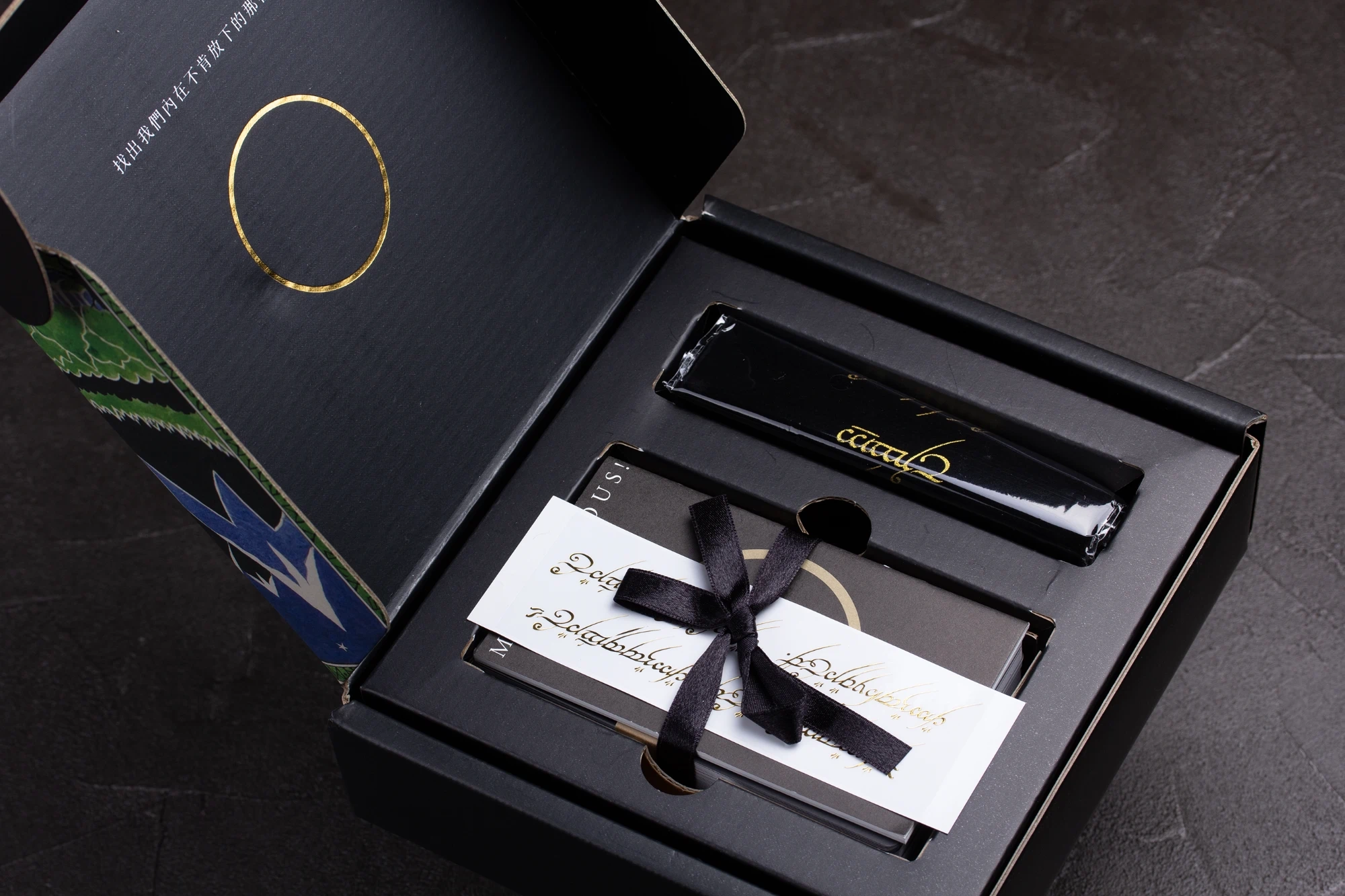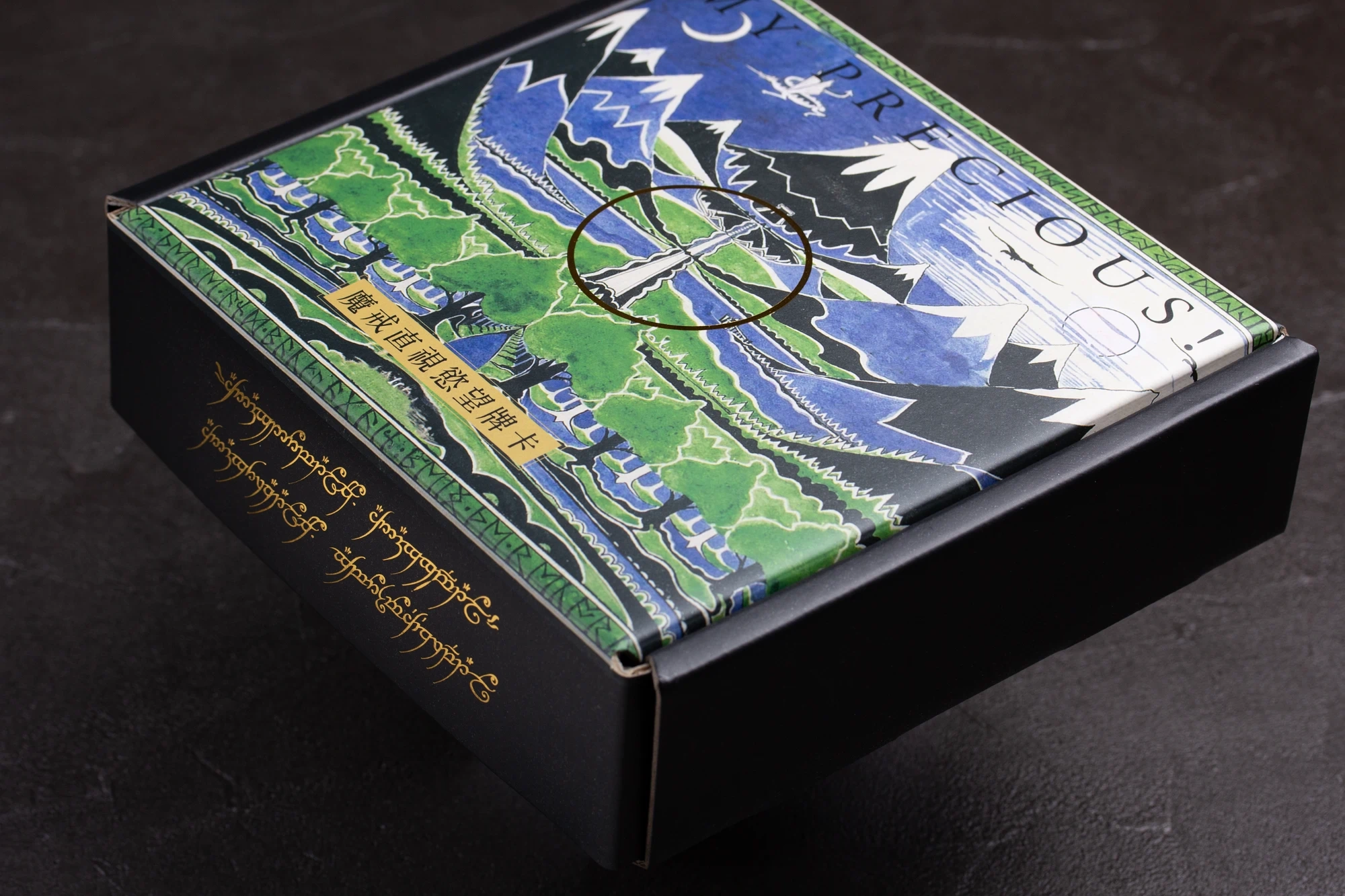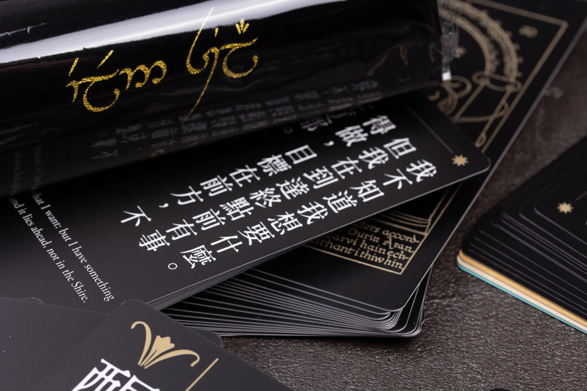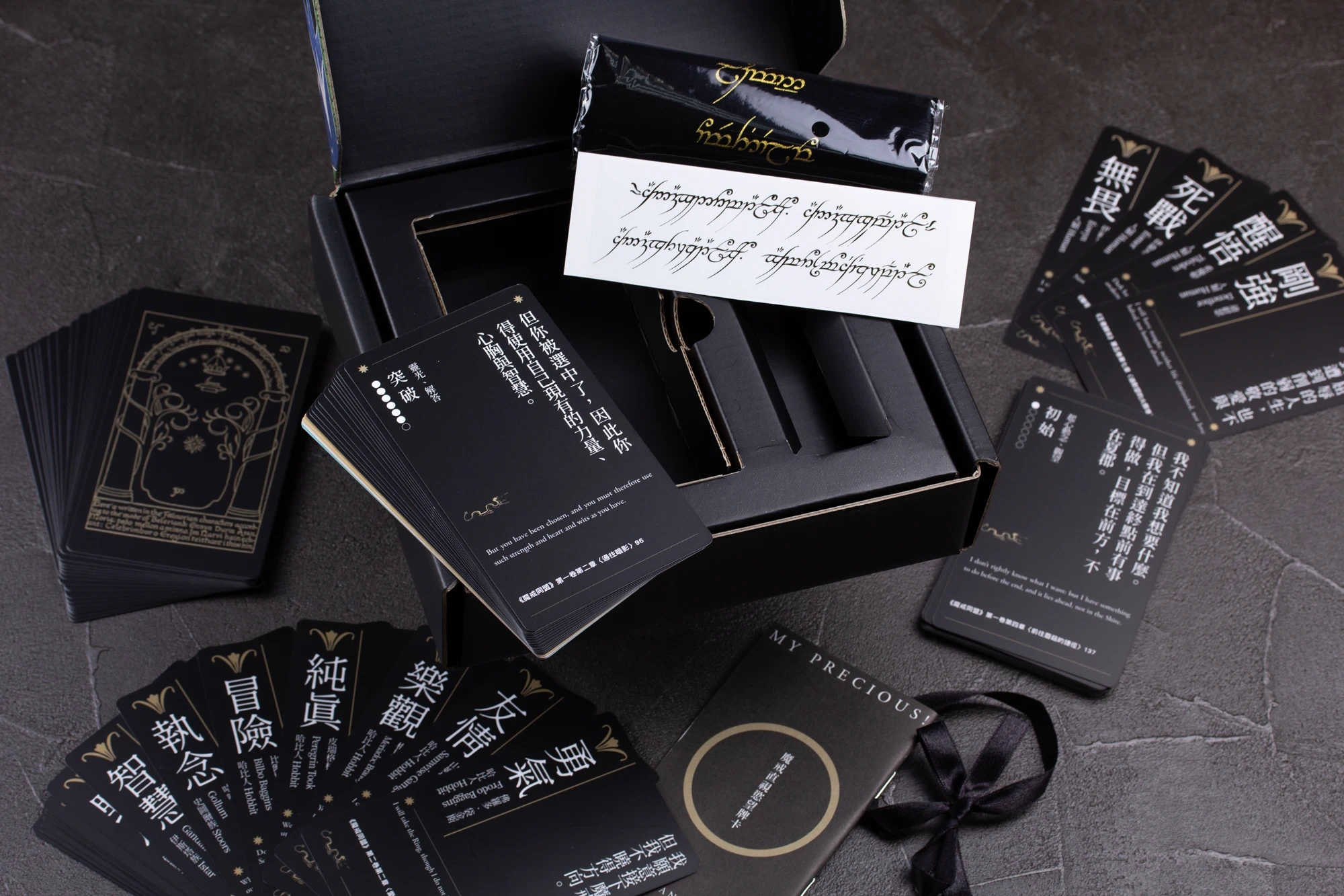 精靈語絨布袋,用以收納和保護牌卡。絨布袋上繡有精靈語,讓整個產品更具收藏價值。